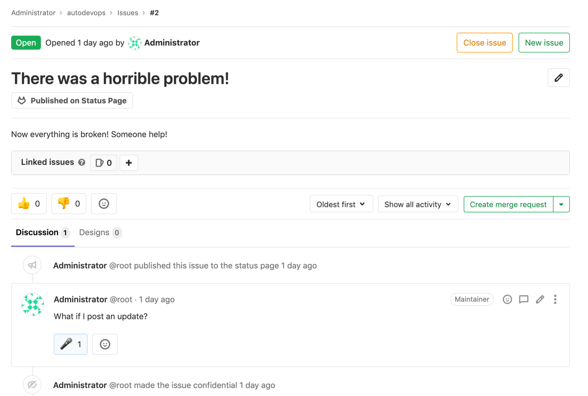 /publishquick action to publish the incident to the GitLab Status Page. Confidential incidents can’t be published.