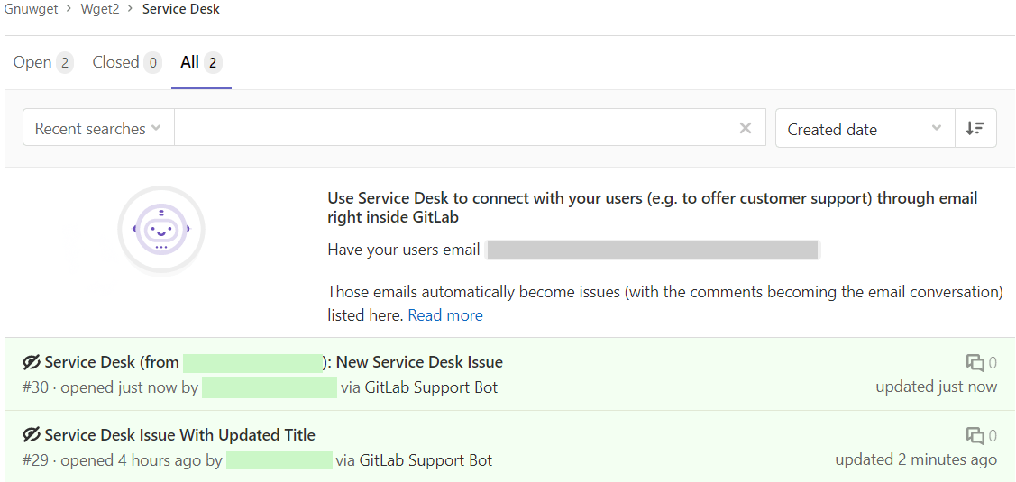 Service Desk issues are confidential, so they are only visible to project members. The project owner can make an issue public. When a Service Desk issue becomes public, the issue creator’s and participants’ email addresses are visible to signed-in users with at least the Reporter role for the project.